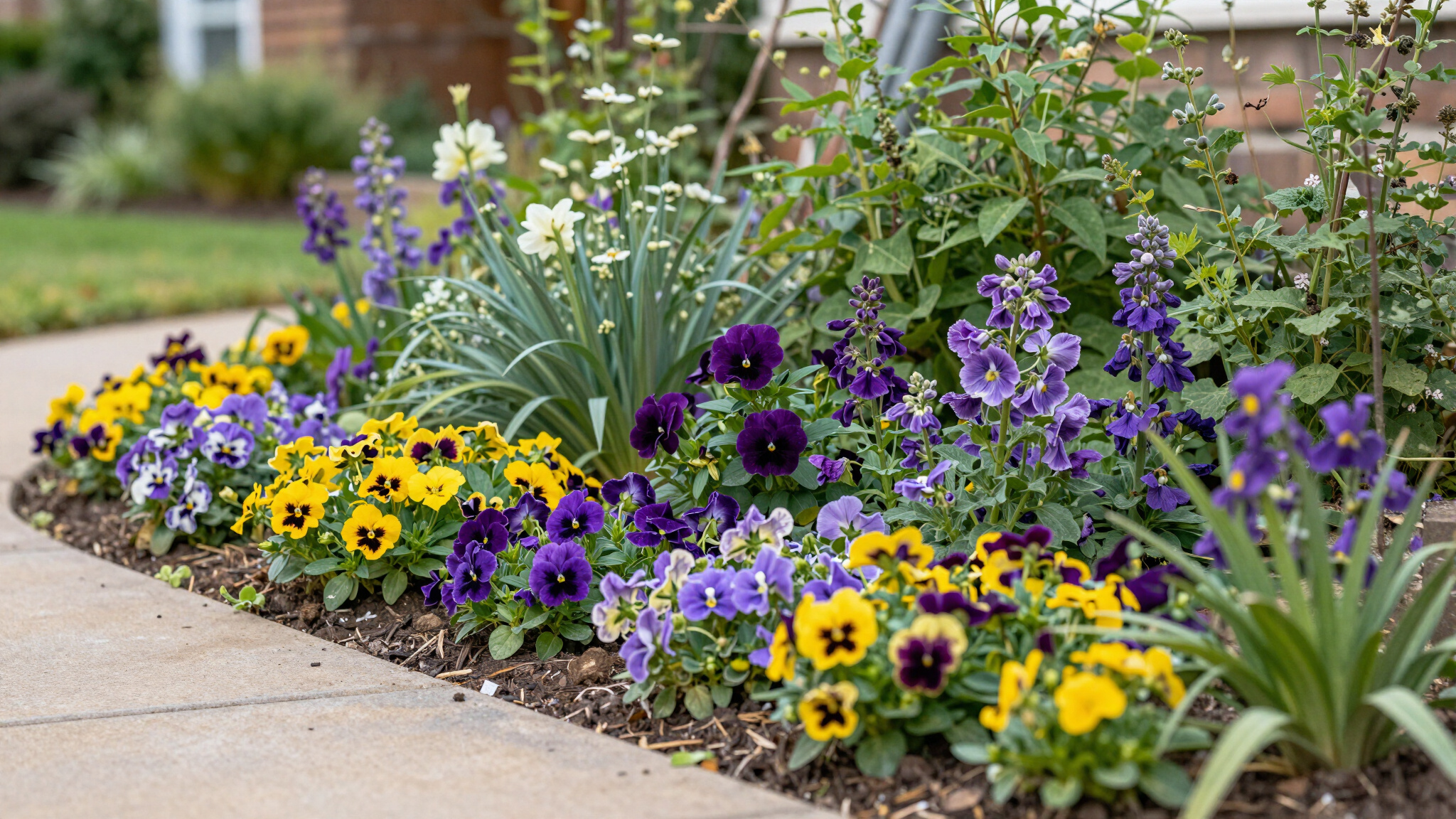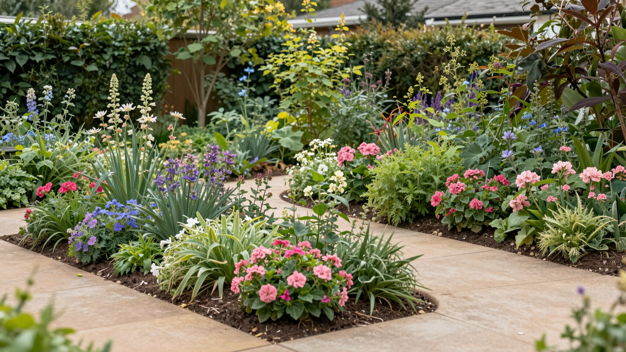 Plant selections are layered by height, texture, and bloom time — tall anchors at the back, mid-height fillers in the center, and low groundcovers or edging plants at the front — creating depth and visual interest from every angle.
