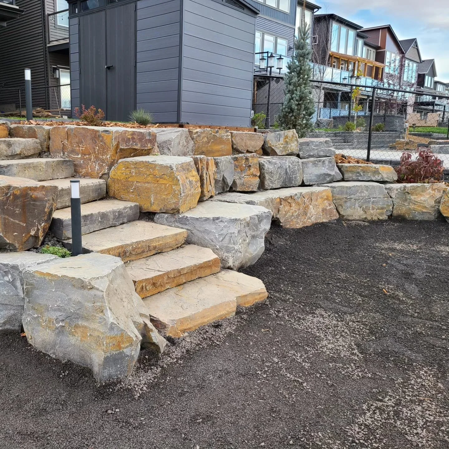 Elevate your curb appeal with high-contrast, architectural stones like Rundle Rock, Alberta Rainbow, or Slate. We use these premium aggregates alongside feature boulders to create depth and texture, giving your yard a custom, high-end look that standard gravel cannot achieve.